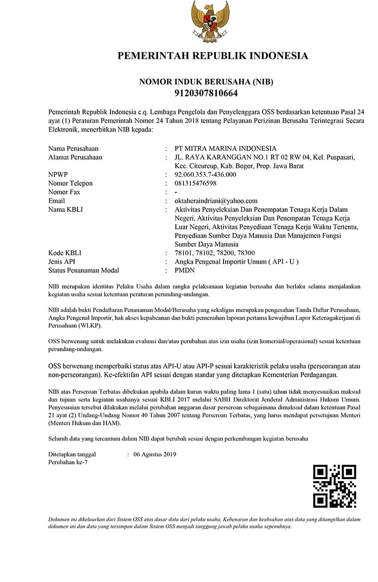 PT. Mitra Marina Indonesiadomiciled in Bogor which was established in 2019. We administer experienced and qualified Officers and ratings crew for all types and sizes of ships to suit each Clients needs. Our philosophy is to provide the best crew members who embrace wholeheartedly our company spirit of teamwork and dedication to excellence, ensuring the operational efficiency of the fleet.